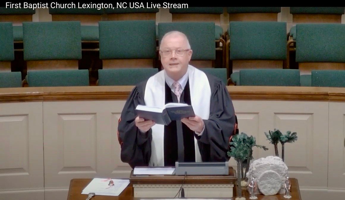 Rev. Dr. Ray Howell delivers the sermon during First Baptist Church of Lexington, NC’s premiere livestream service on Easter Sunday, April 12, 2020.